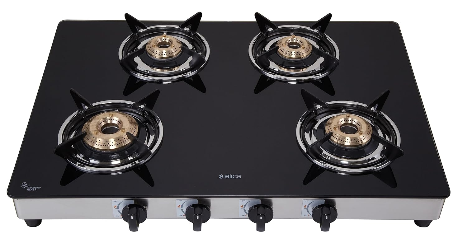 Elica Vetro Glass Top 4 Burner Auto Ignition Gas Stove (694 CT VETRO SS AI), Black